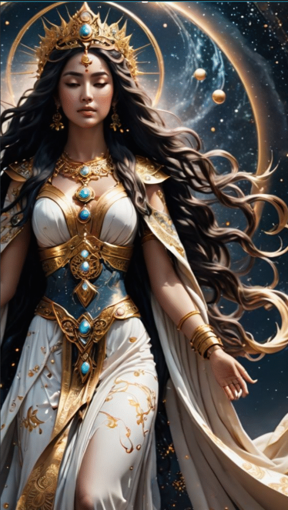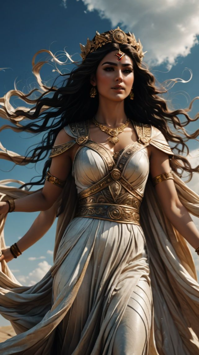 物と衣服の生産を司る女神。文明社会における文化的被膜社会的な秩序の基本的な枠組みを確立する機能。